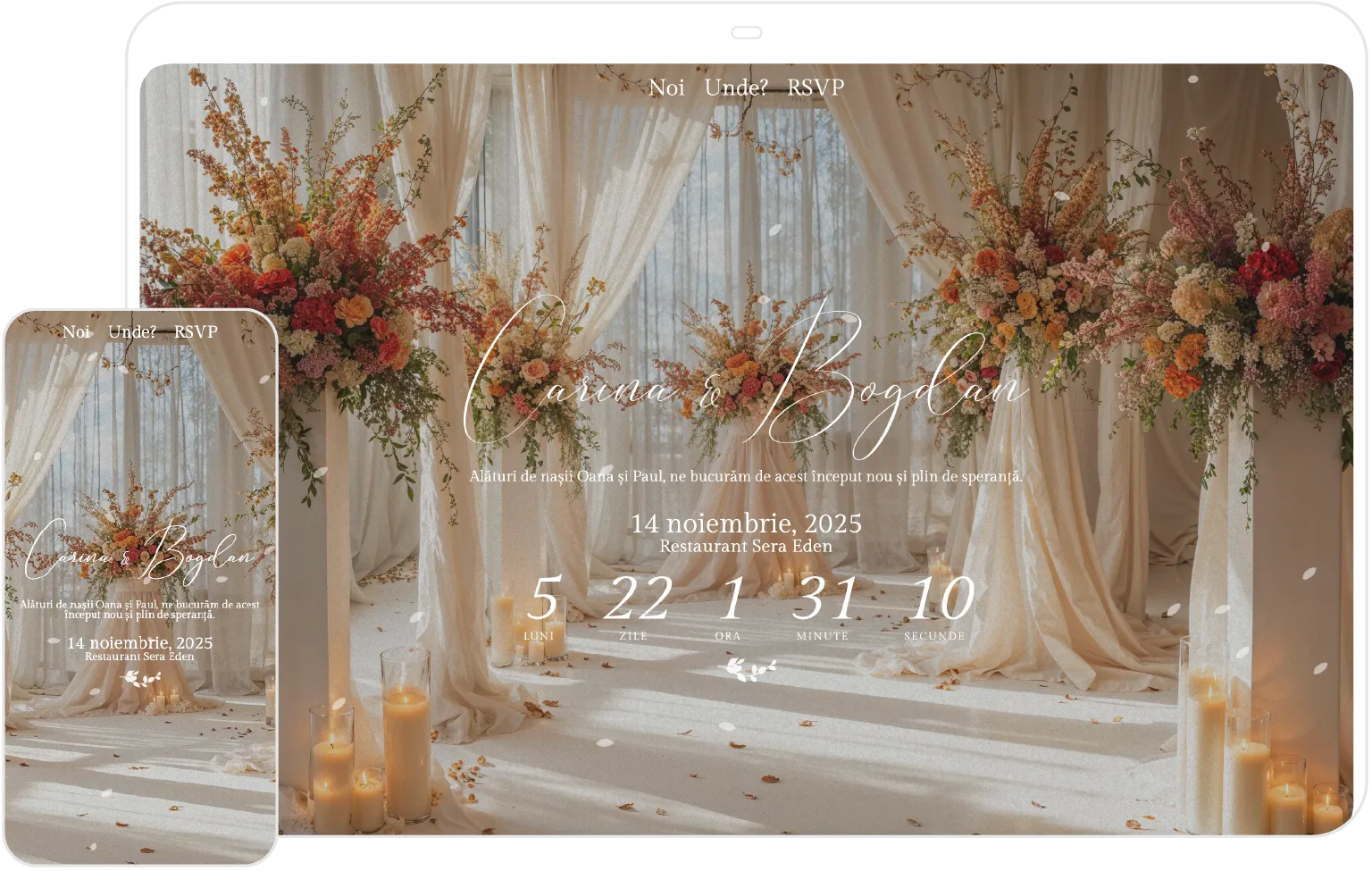 Invitațiile de nuntă online sunt o alternativă modernă la invitațiile tipărite, ideale pentru cuplurile care își doresc invitații digitale elegante, ușor de personalizat și simplu de distribuit. Prin Invitify, poți crea invitații de nuntă online cu formular RSVP, hartă Google și administrare completă a invitaților.